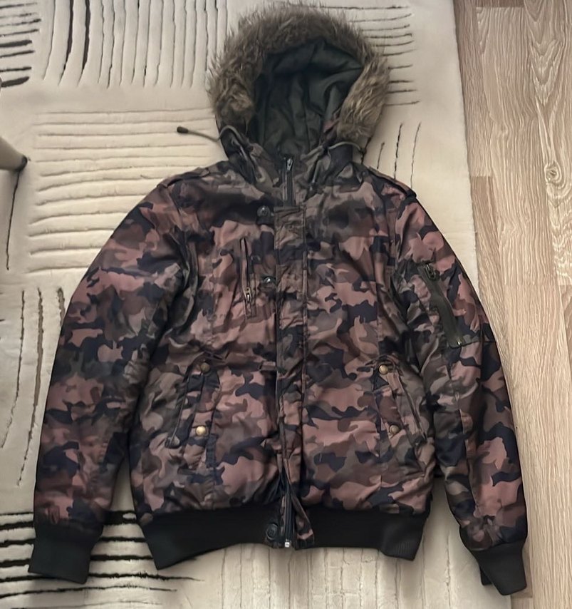 Kürk detaylı kapüşonlu, kahverengi kamuflaj desenli, uzun kollu, normal boy erkek kış montu. Sentetik kumaş ve içi polarlı sokak stiline uygun, trend ve rahat.
