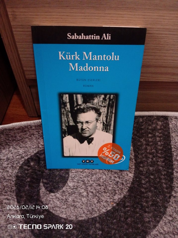 Sabahattin Ali'nin "Kürk Mantolu Madonna" adlı romanı, kapağında yazarın siyah-beyaz fotoğrafı ve indirim etiketi bulunuyor.
