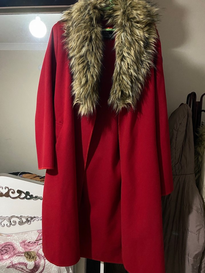 Kürk yaka detaylı kırmızı kaban, uzun kesimi ve yumuşak dokusuyla sıcak tutar.