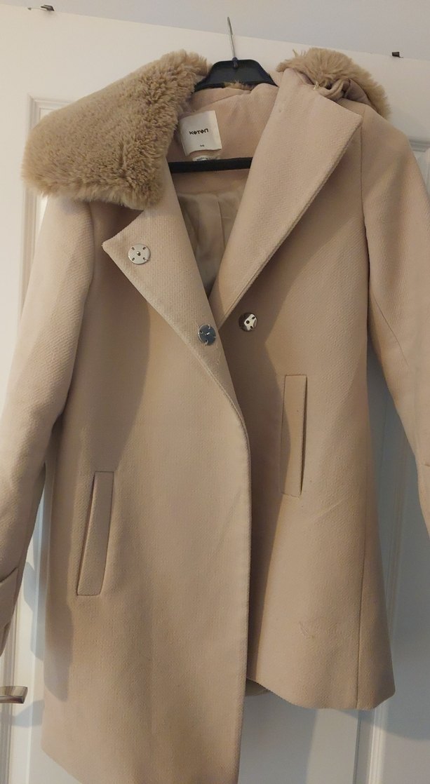 Bej /krem renkte, çıkarılabilir kürk yakalı, düğmeli kapamalı, cepli ve Astarlı kaşe kaban.