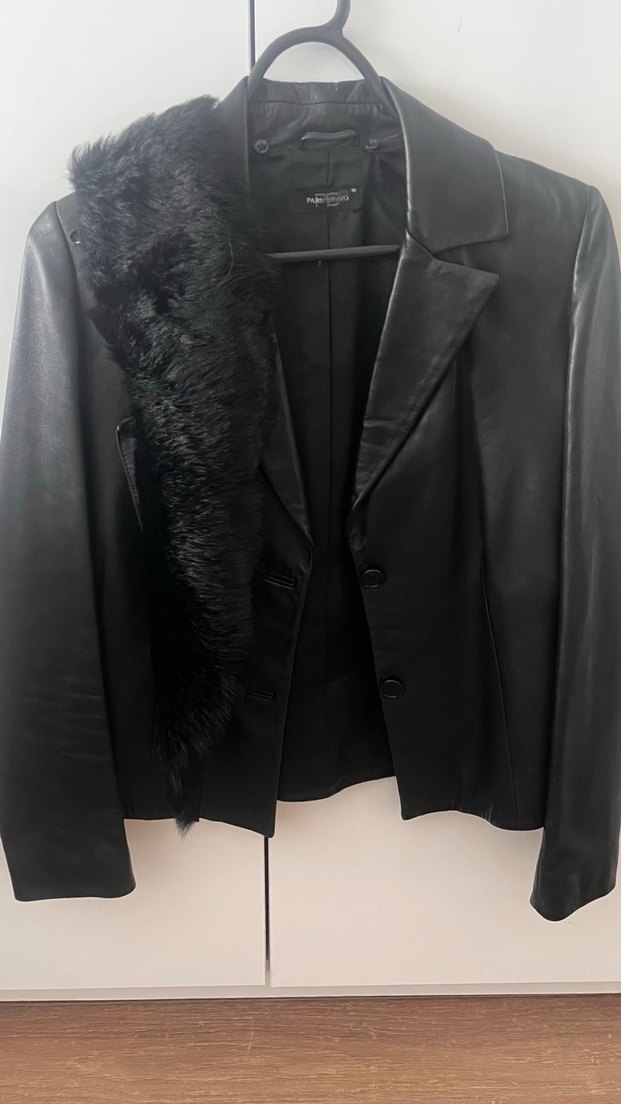 Siyah deri ceket, takıp çıkarılabilir kürk yaka ile dikkat çeker. Uzun kollu, normal kesim ve desensizdir. Ofis için uygundur.