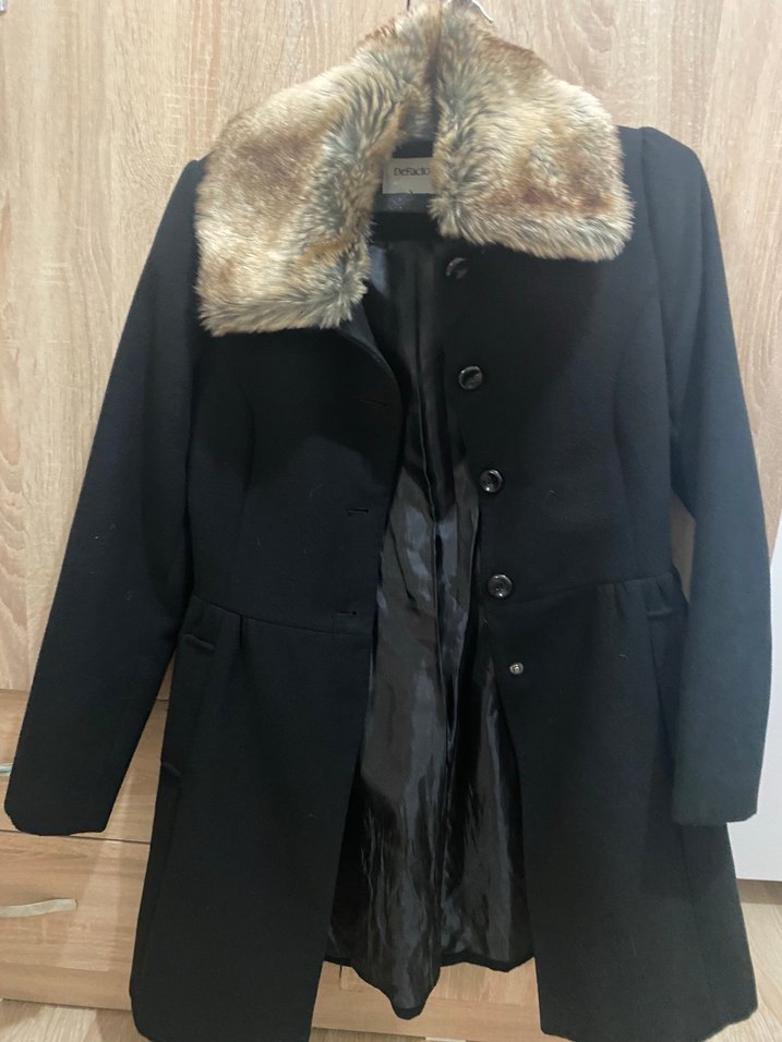 Yumuşak kürk yakalı, düğmeli siyah kaban, rahat kullanım için düzgün iç astarlı.