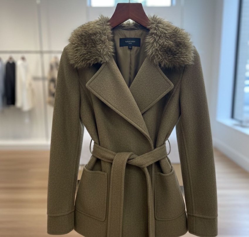 Yumuşak ve sıcak kumaştan, kürk yakalı, kemerli, çift düğmeli ve büyük cepli kaban. adl marka çok kalitelidir
