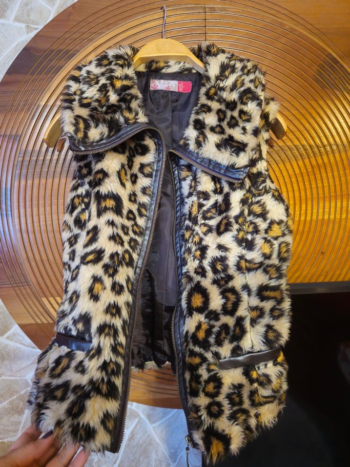 Leopar desenli, kürk detaylı, deri kadın yeleği. Kolsuz, normal boyda, kahverengi ve bohem tarzda günlük ve gece kullanım için uygun.