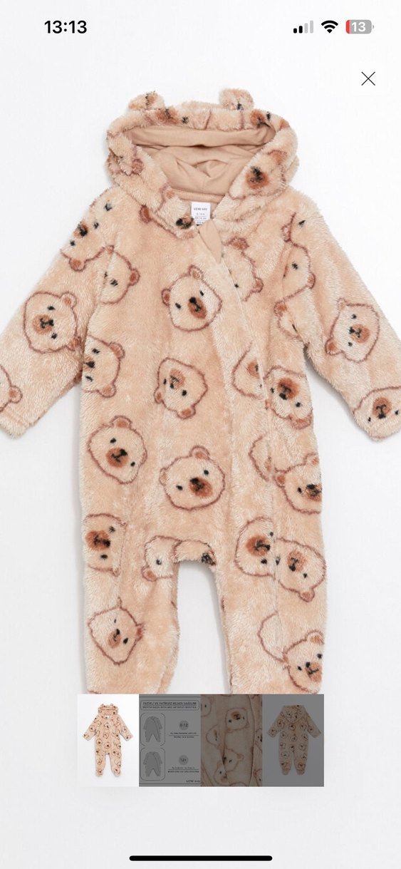 LCW ayaklı Bej renkli bebek erkek tulumu, yumuşak kumaş, kürk detaylı ve ayıcık desenli, az kullanıldı