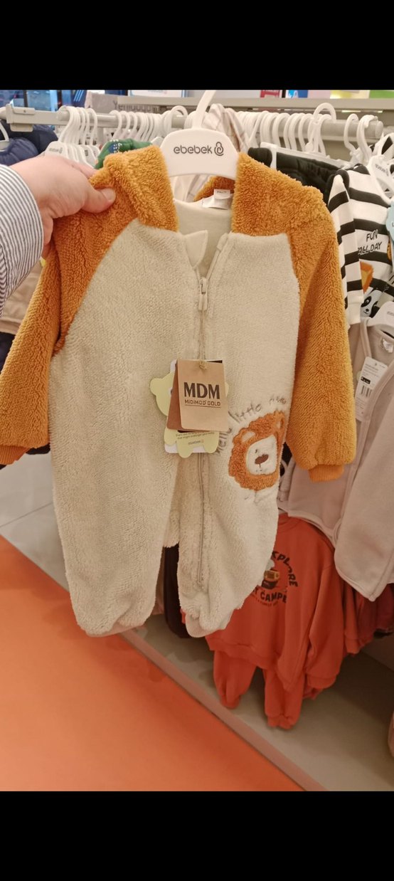 Yumuşak kumaştan, kürklü detaylı, baskılı aslan desenli açık kahverengi bebek tulumu. Önden fermuarlı ve kapüşonludur. Marka: MDM.