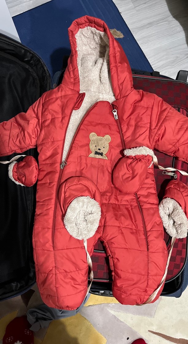 Renkli kırmızı bebek tulumu, kürklü kapüşon ve eldivenlerle, önünde sevimli ayıcık detayıyla. Notch yaka ve sıcak dolgulu tasarım sunar. Ben oğluma kullandım. Hiç bir sıkıntısı yoktur.
