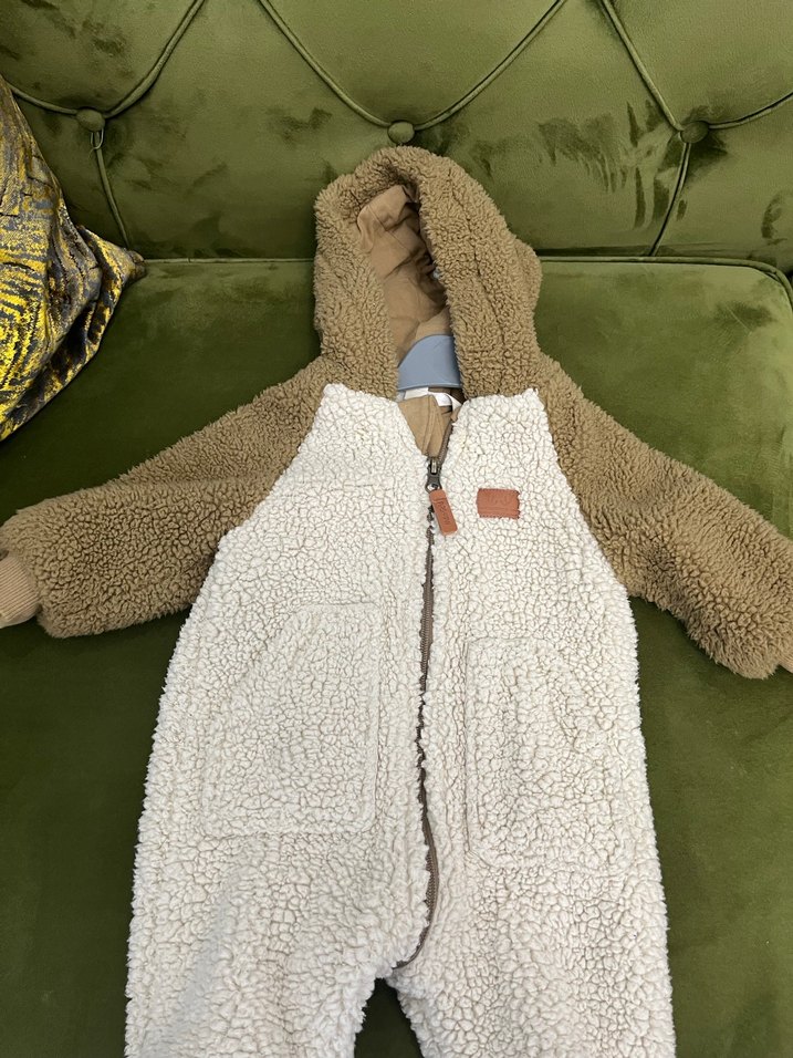 Kürklü detaylara sahip, yumuşak ve sıcak kumaştan yapılmış kahverengi ve gri renkli bebek erkek tulumu. Kapüşonlu ve ön ceplidir. ❄️ markası E BEBEK