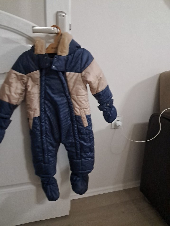 Kürklü detaylara sahip, yumuşak ve sıcak kumaştan yapılmış bebek erkek tulumu. Koyu kahverengi ve bej tonlarında, eldiven ve patikli sokak stili tulum. ❄️
