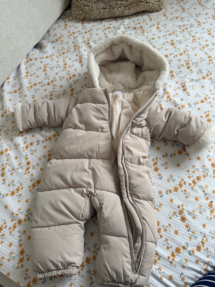 Kürklü kapüşonlu, yumuşak ve sıcak kumaştan yapılmış gri bebek kış tulumu, çentikli yaka ve fermuar kapamalı.