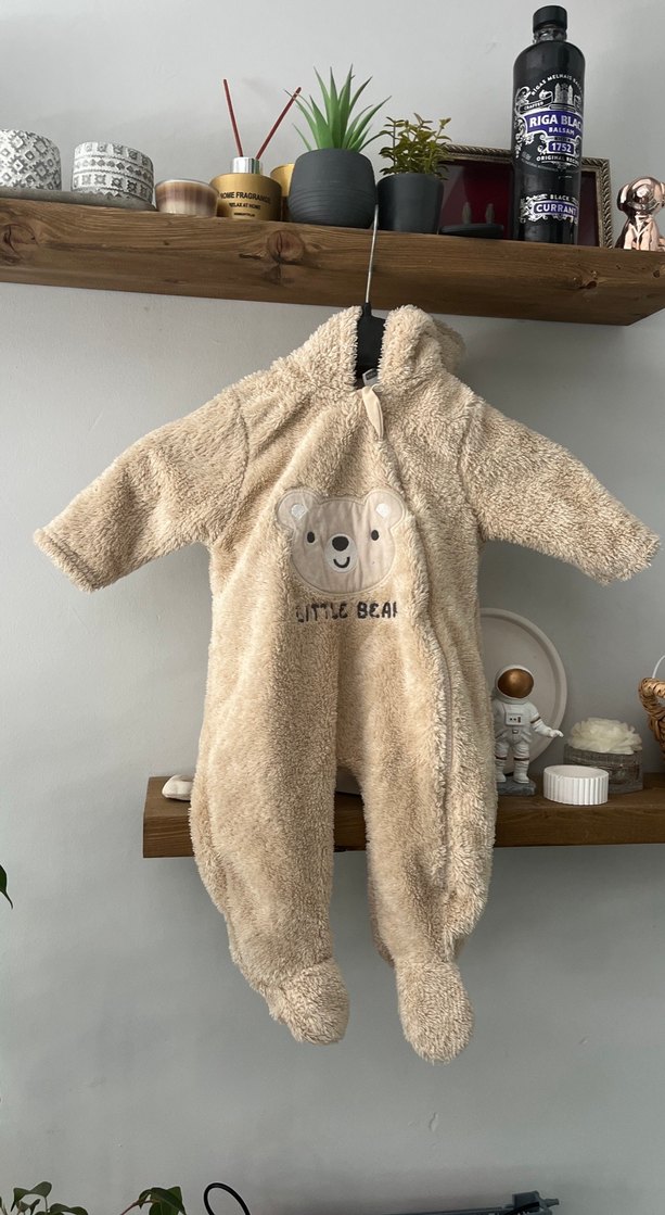 Yumuşak ve sıcak kürklü bej bebek tulumu, baskılı ayı deseniyle. Ön fermuarlı ve ayakları kapalıdır.
