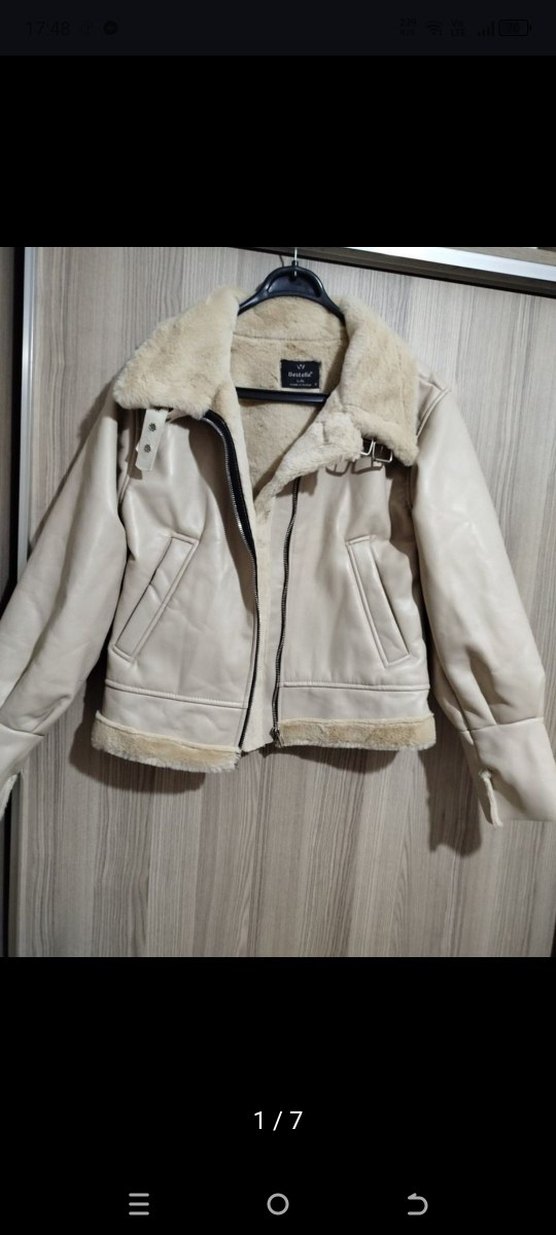 Bej renkte, kürk detaylı deri ceket. Kısa boy, geniş kesim ve yaka detayıyla günlük şık görünüme uygundur. Strappy kollu, rahat bir model.