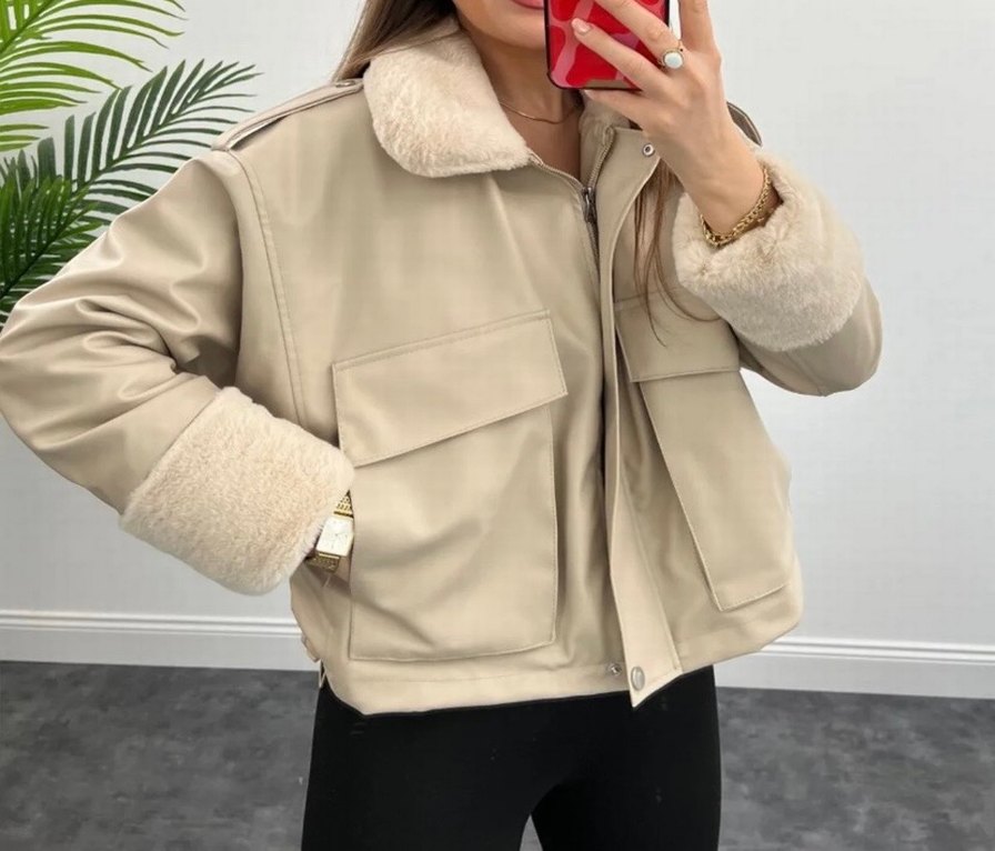 Bej deri ceket, kürk detaylı yaka ve manşetlere sahip. Bol kesim iki kol arası 68 cm