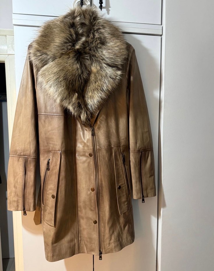 Bej renkli deri kadın ceket, kürklü yakası ve uzun kolludur. Uzun boy ve regular fit kesime sahiptir, günlük kullanım için uygundur.