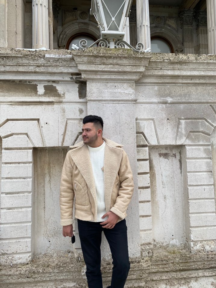 Bu erkek ceketi, kürklü detaylara sahip bej renk ve keskin yakalıdır. Normal kesim, uzun kollu ve midi boyda, günlük sokak stiline uygundur. Az kullanıldı. İsteyene detaylı fotoğraf atarım.