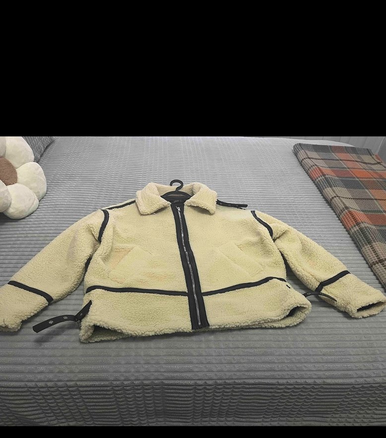 Uzun kollu, kürklü detaylı, bej renk kısa ve fitted kadın ceket. Rahat ve şık sokak stili için uygundur.