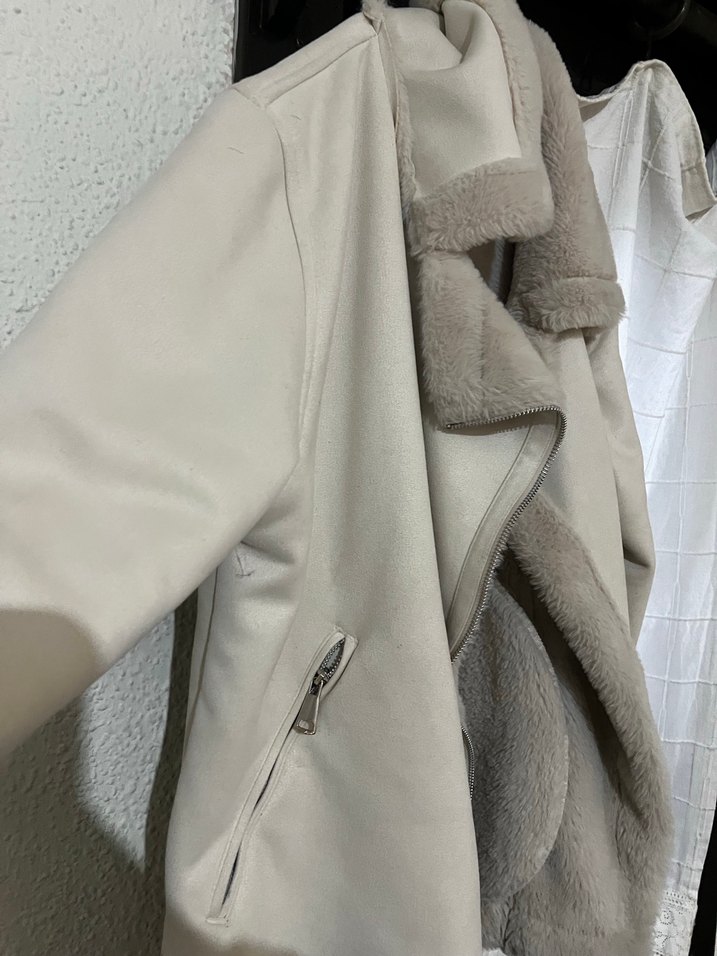 Kürklü detaylı, bej renkte gevşek kesimli vekadın ceket. Yumuşak ve sıcak dokulu kumaştan üretilmiştir, günlük sokak stili için uygundur.