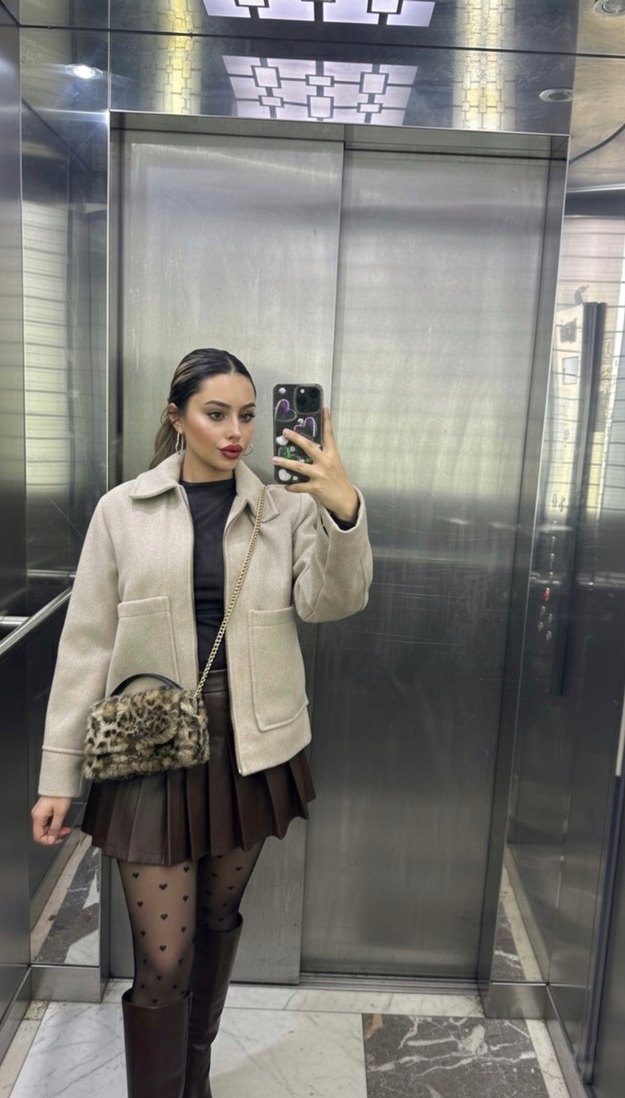 Bej renkte, uzun kollu, notalı yakalı, kürklü detaylı bol kesim kadın deri ceket. Leopar desenli çanta ile kombinlenmiş, günlük kullanıma uygun.