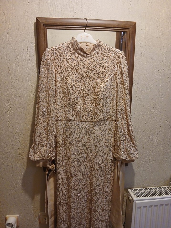 Kürklü detaylı, ipeksi bej kadın fuları, parlak bir görünüme sahiptir. Avangart ve bohem tarzlara uygundur.