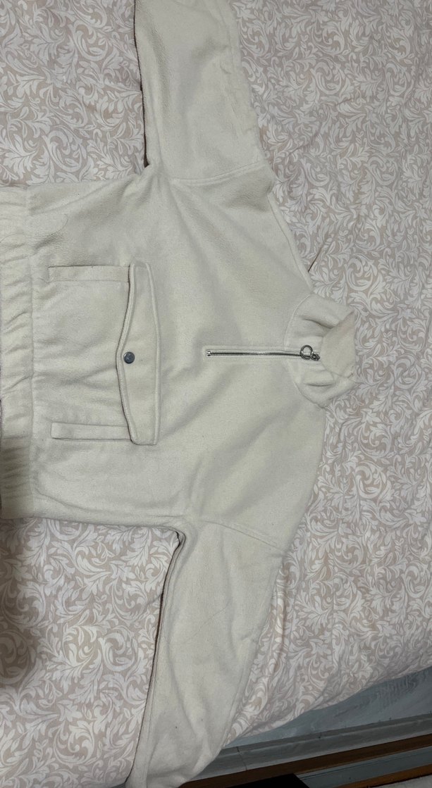 Kadınlar için yüksek yakalı, uzun kollu ve bol kesim bej renkte, yumuşak ve sıcak kumaştan yapılmış kürk detaylı kısa ceket. Önünde düğmeli cep bulunur.