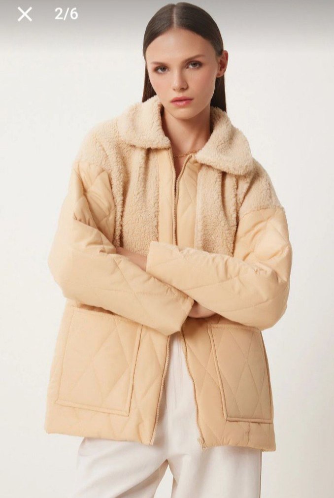Bej renkli kadın kışlık ceket, bol kesim, yakalı ve uzun kolludur. Kürk detaylı, yumuşak ve sıcak kumaştan, kısa boyda, günlük kullanıma uygundur.
