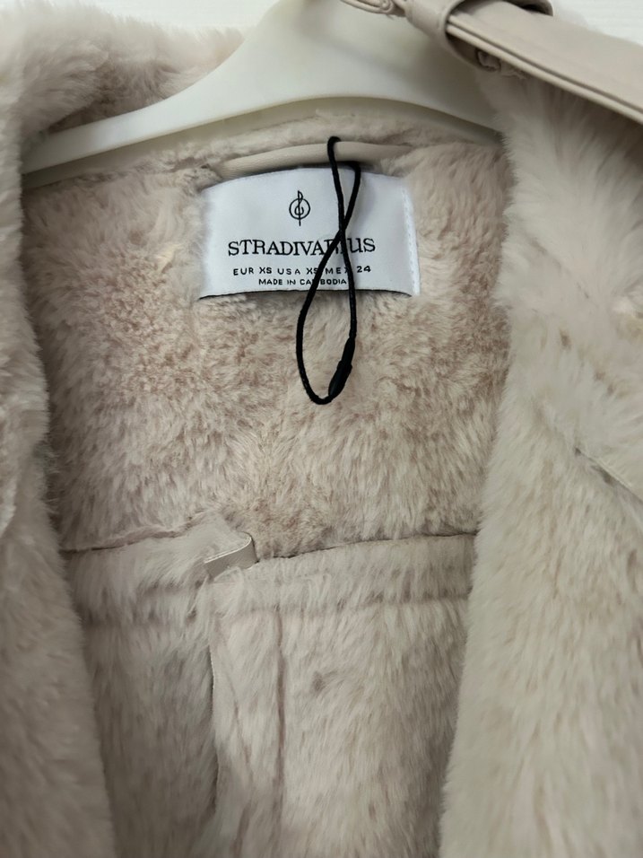 Strap detaylı, kesimli bej midi ceket, sentetik kürk detayları ve baskılı desenle. Sokak modasına uygun şık parça.