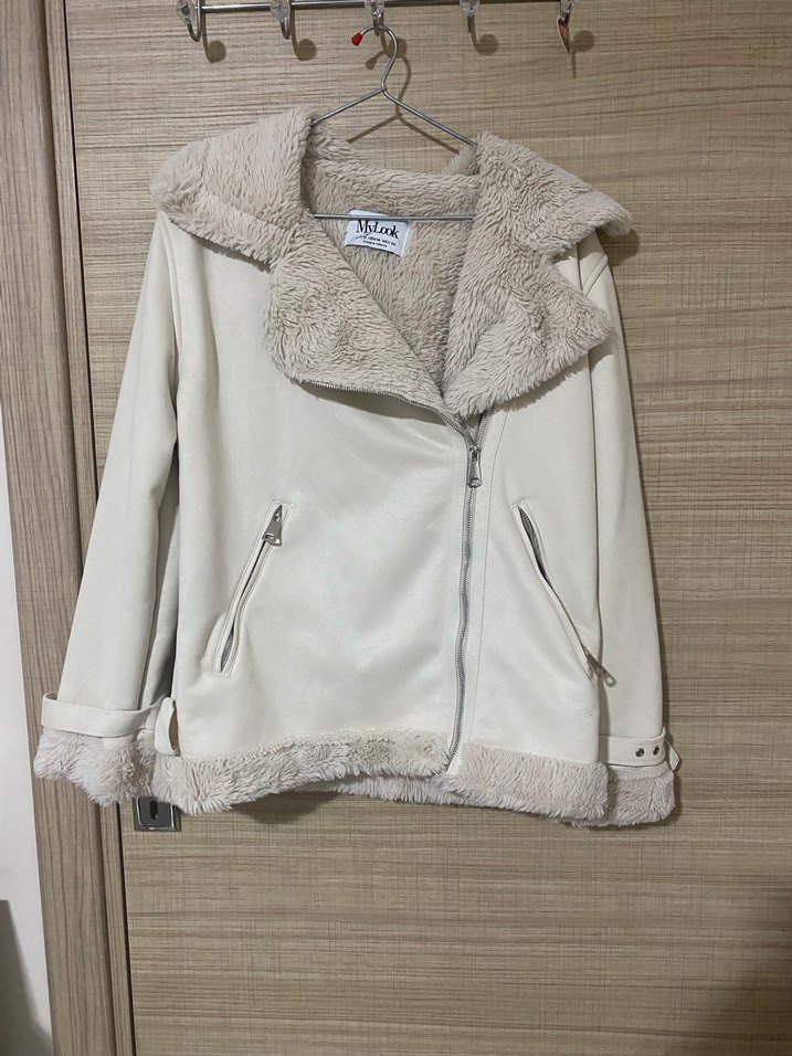 Bej renkli, kısa kesim ve bol kalıplı kadın ceketi, yakasında, manşetlerinde ve etek ucunda kürk detaylara sahiptir. Uzun kollu ve yumuşak sıcak kumaştan üretilmiştir. Fermuarlı cepleri ve baskılı deseniyle günlük sokak stili için uygundur. Fermuarında kullanıma bağlı hafif yıpranmalar mevcut