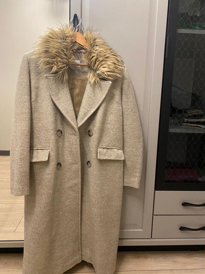 Bu bej kadın uzun kaban, kürklü yaka ve normal kesim özelliklerine sahiptir. Yünü kumaştan yapılmış, uzun kollu ve desensizdir, ofis için trend bir rahat stil sunar.