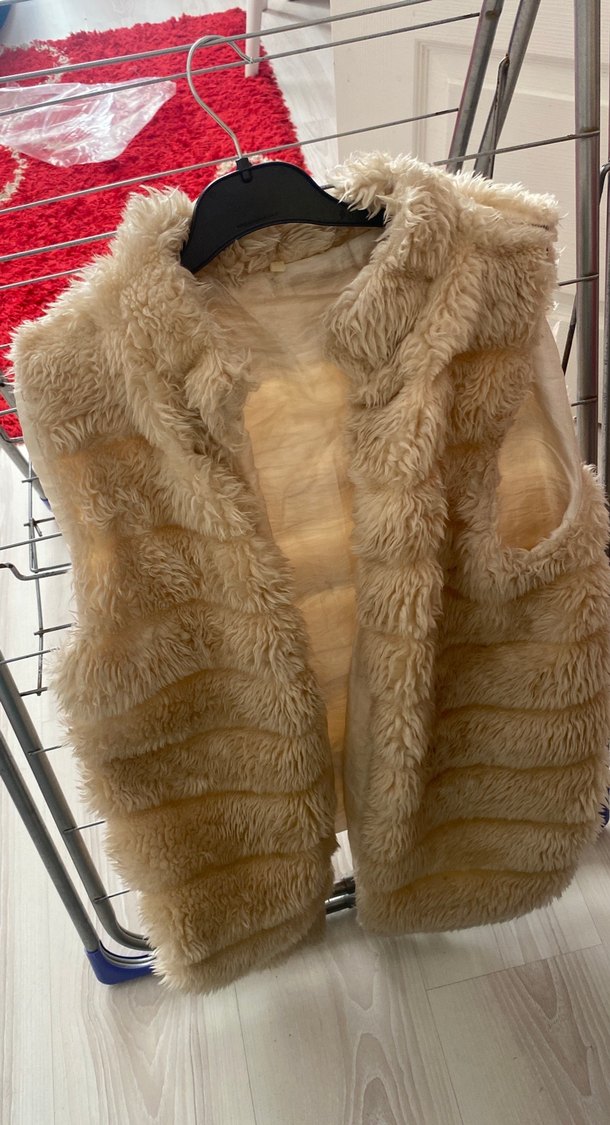 Yumuşak sentetik kürk detaylı, askısız ve fitted kesimli bej renkli kadın yelek, şık sokak stili için uygundur.