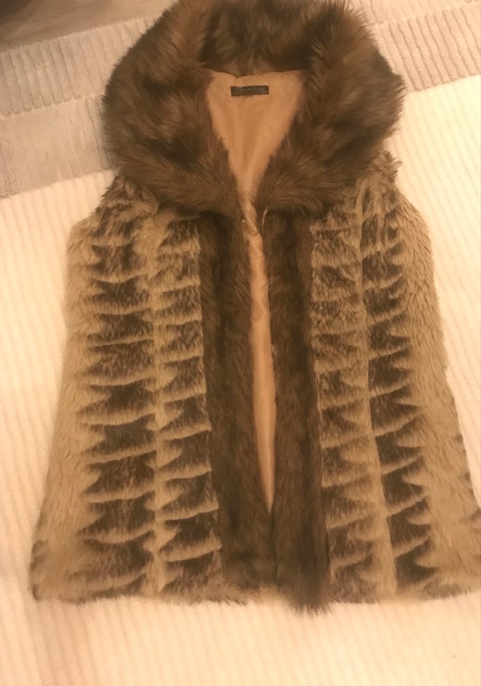 Yumuşak sentetik kumaştan, kürklü detaylı, yüksek yakalı, kolsuz bej yelek. Fitted kesim ve midi uzunlukta, günlük kullanım için uygun.