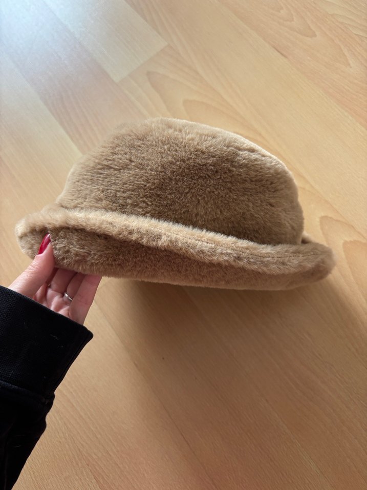 Yumuşak tüğlü, kürk detaylı bej-kahve kadın şapka, sıcak ve nostaljik bir tarz sunar. Soğuk havalar için uygundur.