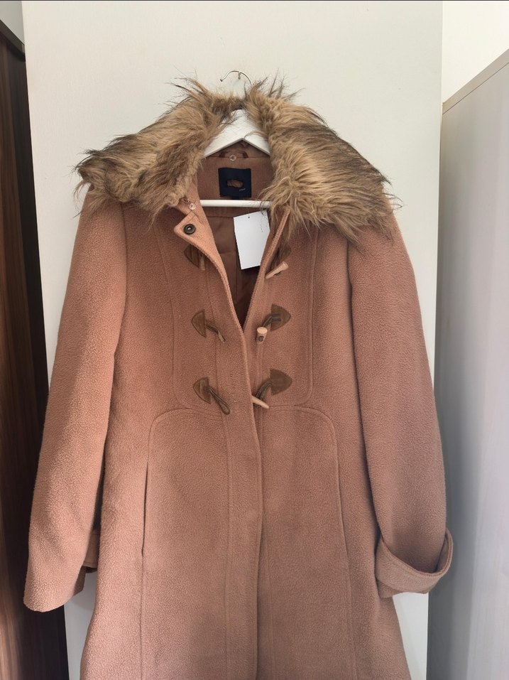 Bu bej midi uzunlukta kadın kaban, kürklü yaka detayına sahip ve bol kesimdir. Yumuşak ve sıcak kumaştan üretilmiş, uzun kolludur ve sokak stili için uygundur.