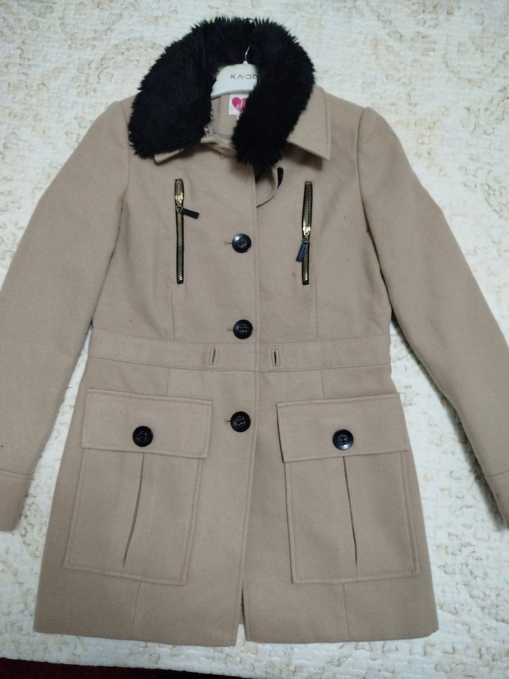 Siyah kürklü yakalı, bej renk midi uzunlukta kadın kaban. Düğmeli, fermuarlı detaylar ve cepler bulunur. Rahat kesim, günlük kullanıma uygun.