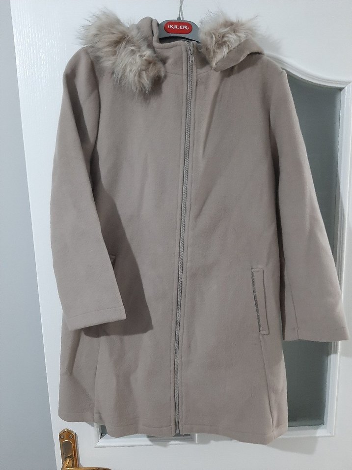 Kürklü detaylı, bej renkli, midi boy, uzun kollu kadın kaban. Yumuşak ve sıcak kumaştan, rahat ve şık bir sokak stili parçası giyilmemiştir yeni
