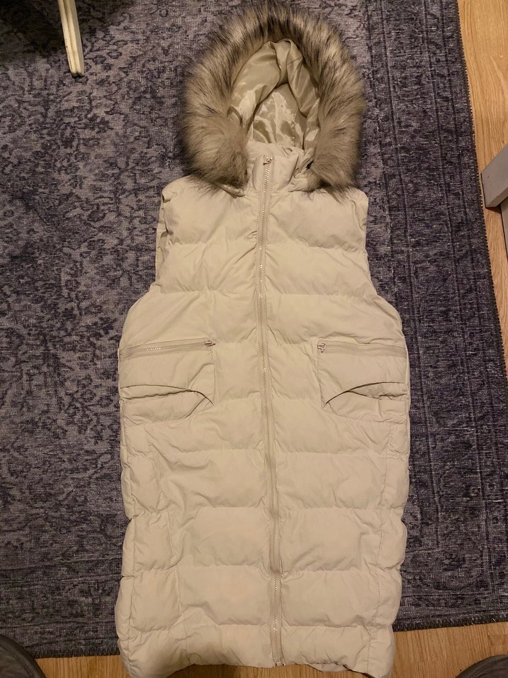 Kürklü kapüşonlu, bej midi uzunlukta kadın yelek. Yumuşak ve sıcak fleece kumaştan, cepli ve fermuarlı, sokak stiline uygun.