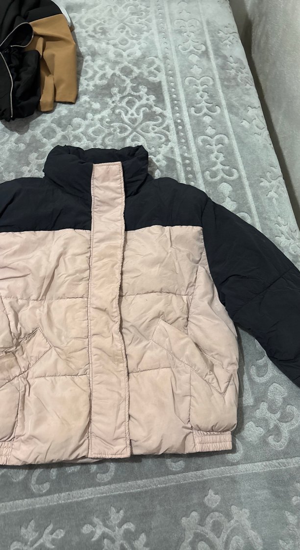 Kadınlar için bej ve siyah renkte, kürklü detaylı, yüksek yakalı, uzun kollu, normal uzunlukta ve bol kesim kışlık ceket. Trend sokak stili için uygundur. ❄️