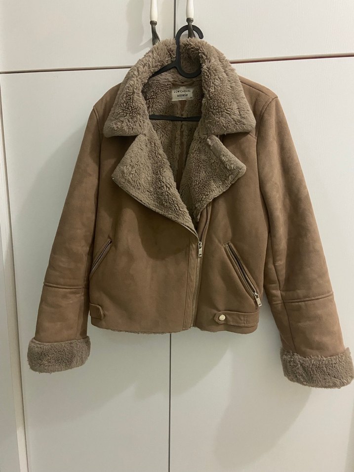 Fitted kesim bej süet ceket, uzun kollu ve kürklü detaylara sahip. Notch yaka ve fermuarlı cepler bulunur, günlük kullanıma uygun rahat ve şık bir tasarım.