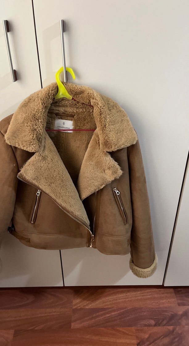 Bej süet ceket, kürk detaylı, kesimli yakalı ve vücuda oturan modeldir. Askılı kol tasarımı ve normal midi boyuyla günlük rahat sokak stiline uygundur.