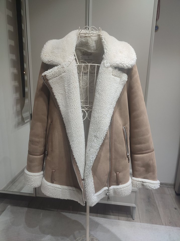 Bej süet kadife kumaş, kürklü detaylar, kesik yaka ve midi uzunlukta rahat kesim kadın ceket.Orjinal üründür kemeri yok