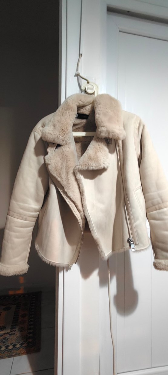 Kürklü detaylı, kısa boy bej süet kadın ceket. Notlu yaka ve fermuarlı, sokak stili için uygun, rahat ve şık bir tasarım.