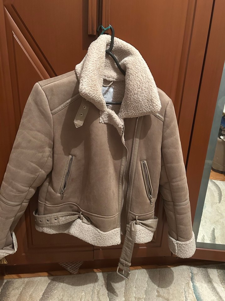 Bej süet kumaştan, kürklü detaylı ve kesimi vücuda oturan kadın ceket. Yaka kısmı notched lapel ve fermuarlı ceplidir. Günlük şık kullanıma uygundur. Çok minik cep yanında lekesi var