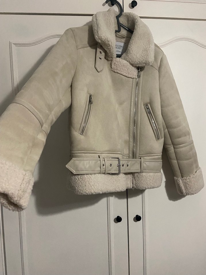 Kürklü yaka, manşet ve etek ucu detaylı, bej süet kısa ve dar kesim ceket. Fermuarlı cepler ve kemerli bel ile sokak modasına uygun. 1 kere giyildi dar geldiği için giymiyorum