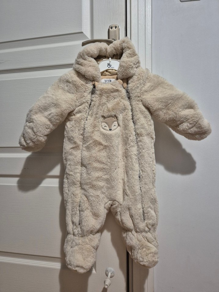 Bej renkli bebek tulumu, yumuşak kürk detaylı ve yakasında notchlu lapel bulunur, desensizdir. Hiç kullanılmadı.
