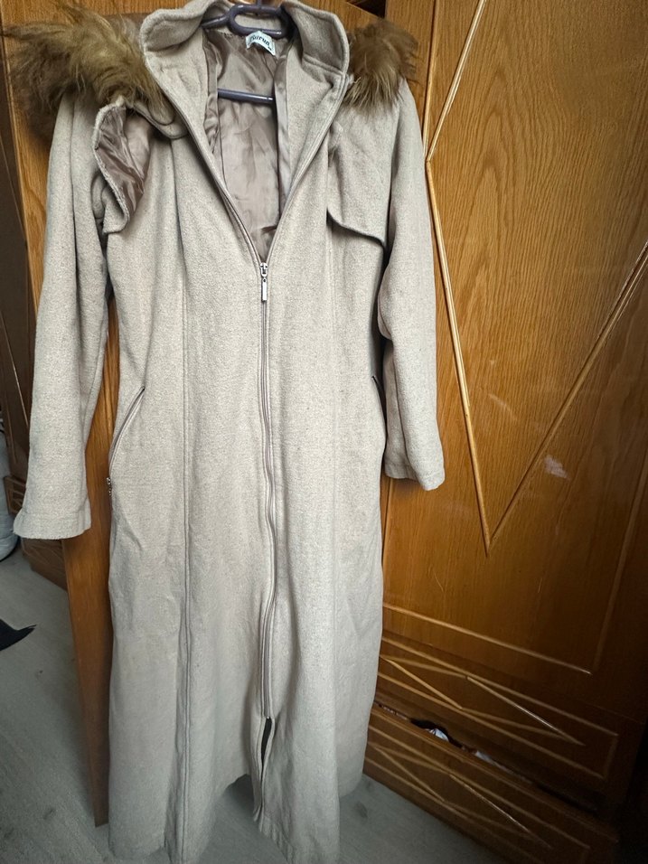 Bej renkte, kapüşonunda kürk detaylı uzun kaban. Yumuşak dokulu kumaştan, regular fit ve uzun kollu, günlük kullanıma uygun.