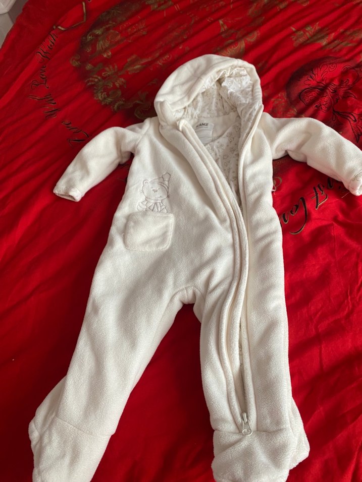 Kürklü detaylara sahip beyaz bebek kız tulumu, yumuşak ve sıcak tutan kumaştan yapılmıştır. Sorunsuzdur