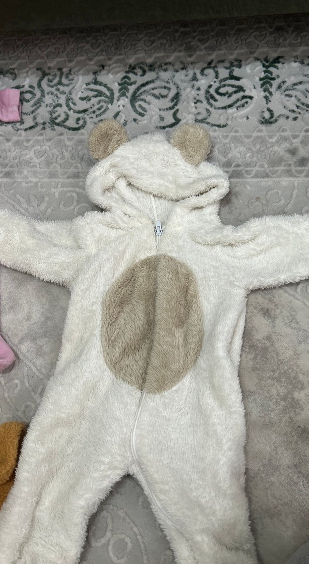 Yumuşak ve sıcak kumaştan yapılmış, kürk detaylı beyaz ve gri bebek tulumu. Kapüşonunda ayı kulakları ve önde fermuar bulunur.