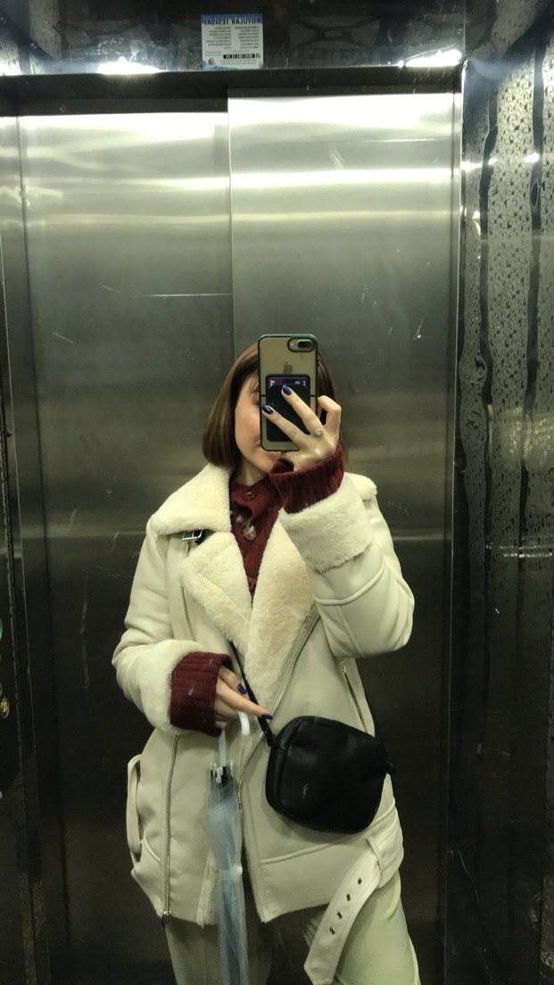 Kürklü detaylara sahip, uzun kollu ve yakalı beyaz kadın kışlık ceket. Yumuşak ve sıcak kumaştan, günlük kullanıma uygun, gençler için trend rahat stil.