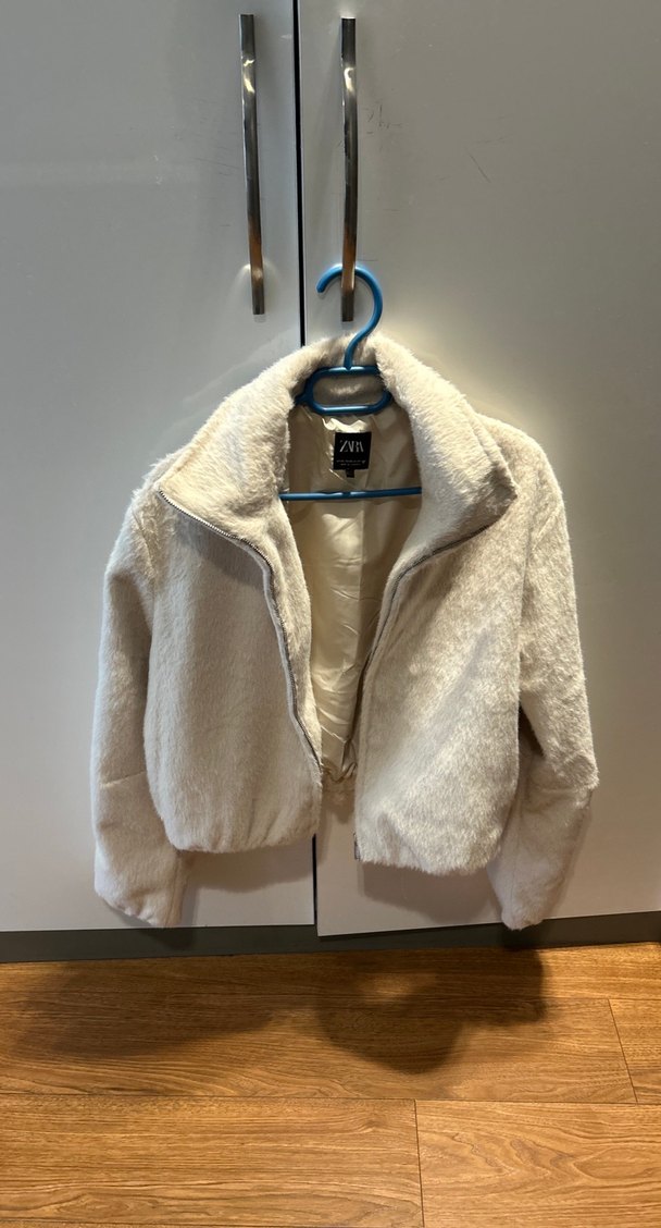 Yumuşak kumaştan, kürklü detaylı beyaz mini ceket. Yüksek yakalı, uzun kollu ve bol kesim, rahat sokak stili için uygun.