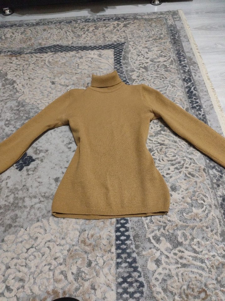 Fitted bej yün kazak, boğazlı ve uzun kollu, kürk detaylı, rahat ve sıcak. Sokak stili ve günlük kullanım için uygun.