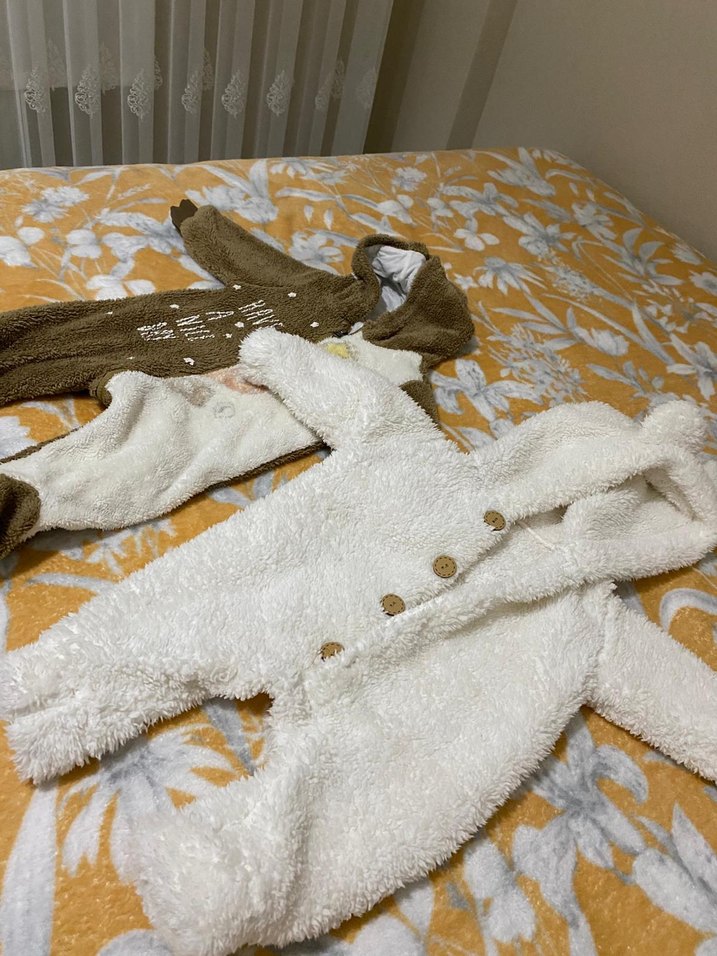 Yumuşak ve sıcak kumaştan, kürklü detaylı, nakışlı bohem tarzda kahverengi ve gri tonlarında bebek tulumu. ❄️